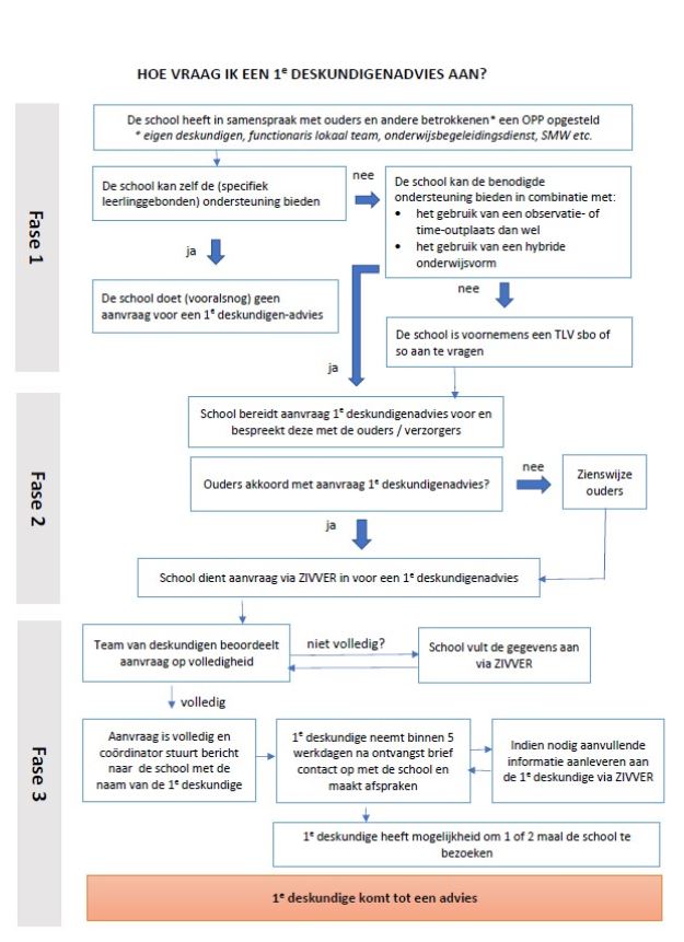 Wanneer de school onvoldoende tegemoet kan komen aan de onderwijsbehoeften van een leerling, is het mogelijk dat een leerling beter past binnen het speciaal basisonderwijs (SBO) of het speciaal onderwijs (SO). Om een leerling op een dergelijke onderwijsvoorziening te kunnen plaatsen, is het nodig een zogeheten 1e deskundigenadvies aan te vragen bij het samenwerkingsverband. In onderstaand stroomschema staat vermeld hoe deze aanvraag verloopt.